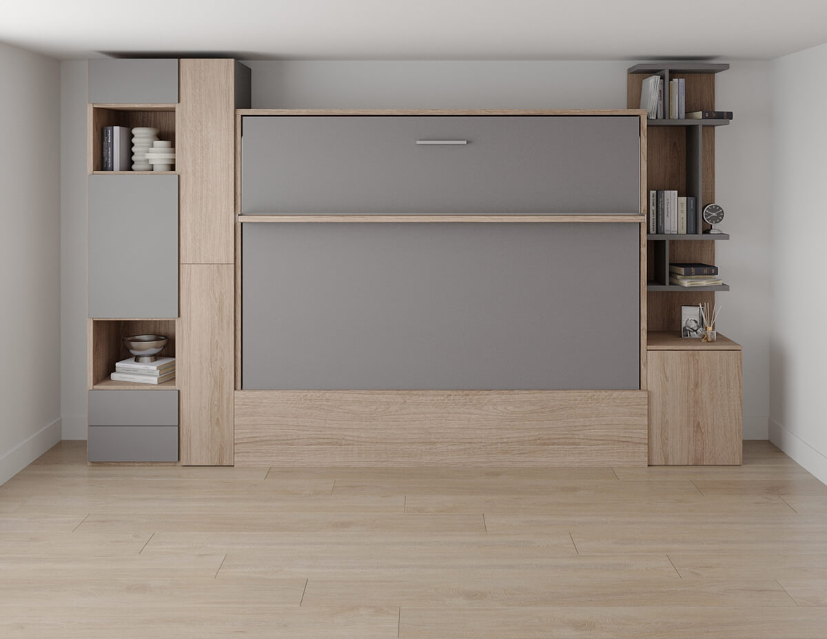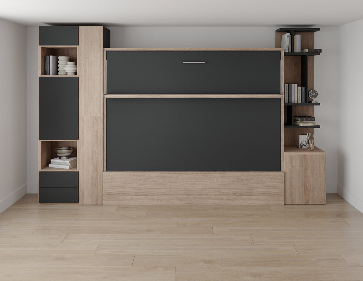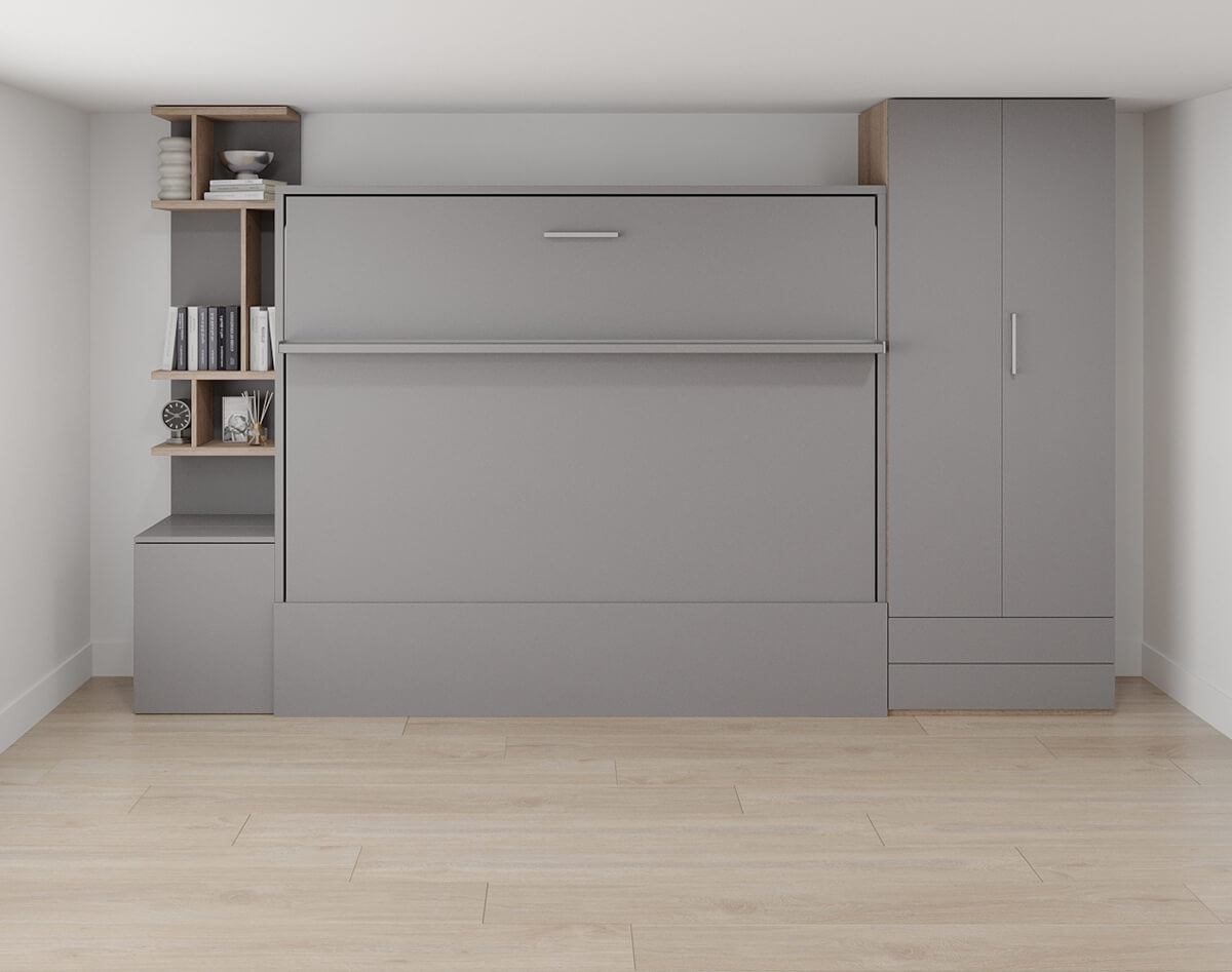 D - Royal Horizontal Queen Wall Bed with Wardrobe and Bookcase Set