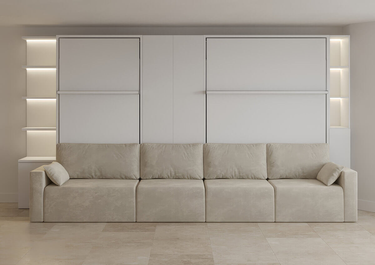 D - Royal Queen and Twin Wall Bed with Sectional Sofa Bookcase and Wardrobe