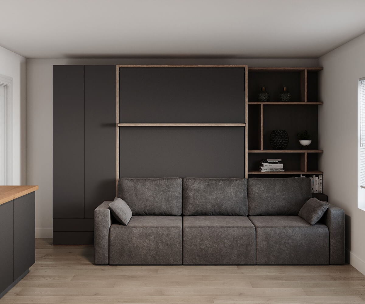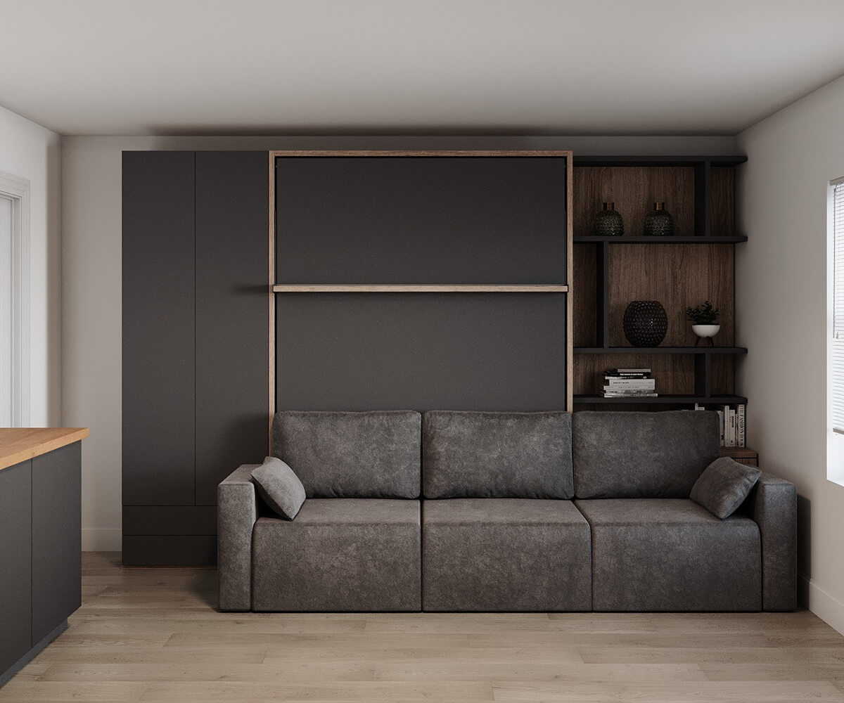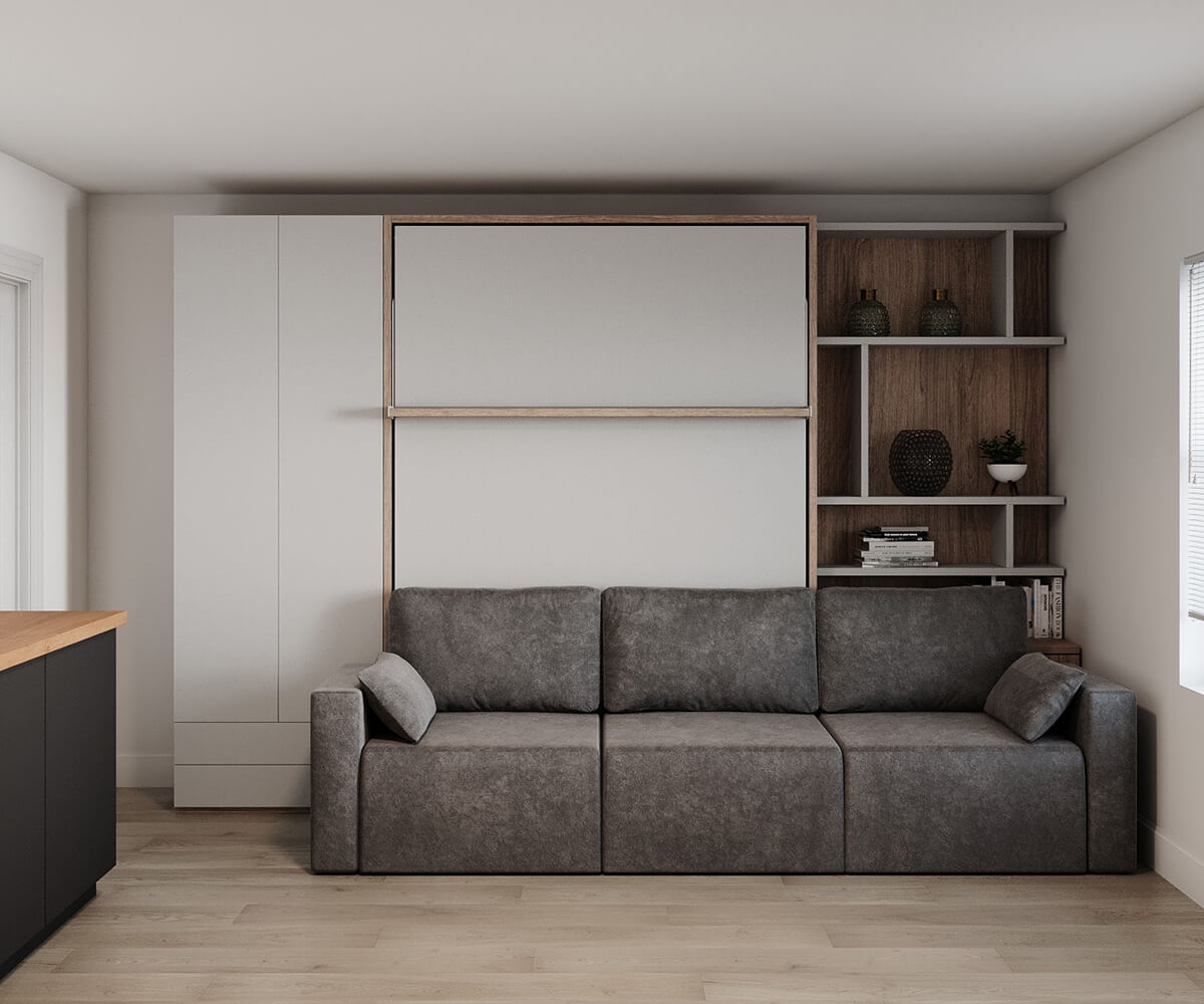 D - ROYAL Queen Wall Bed with Sectional Sofa and Bookcase Set