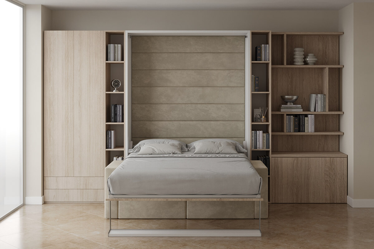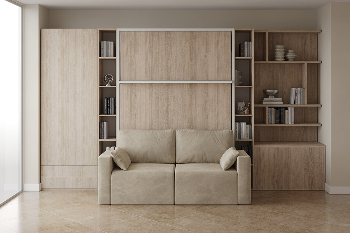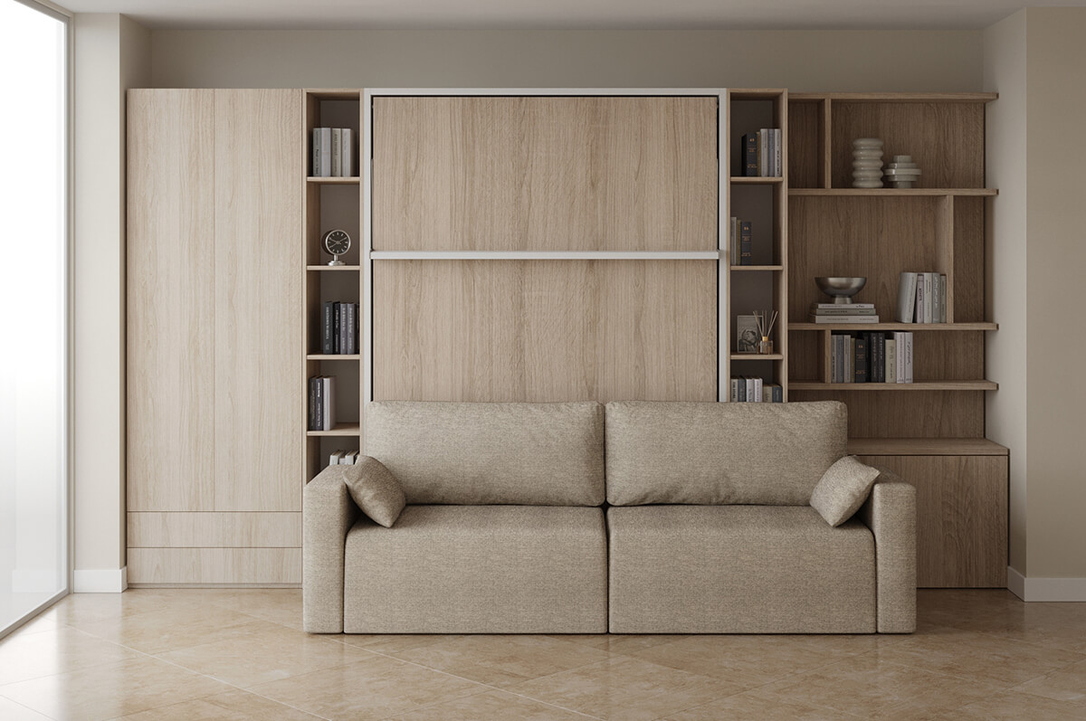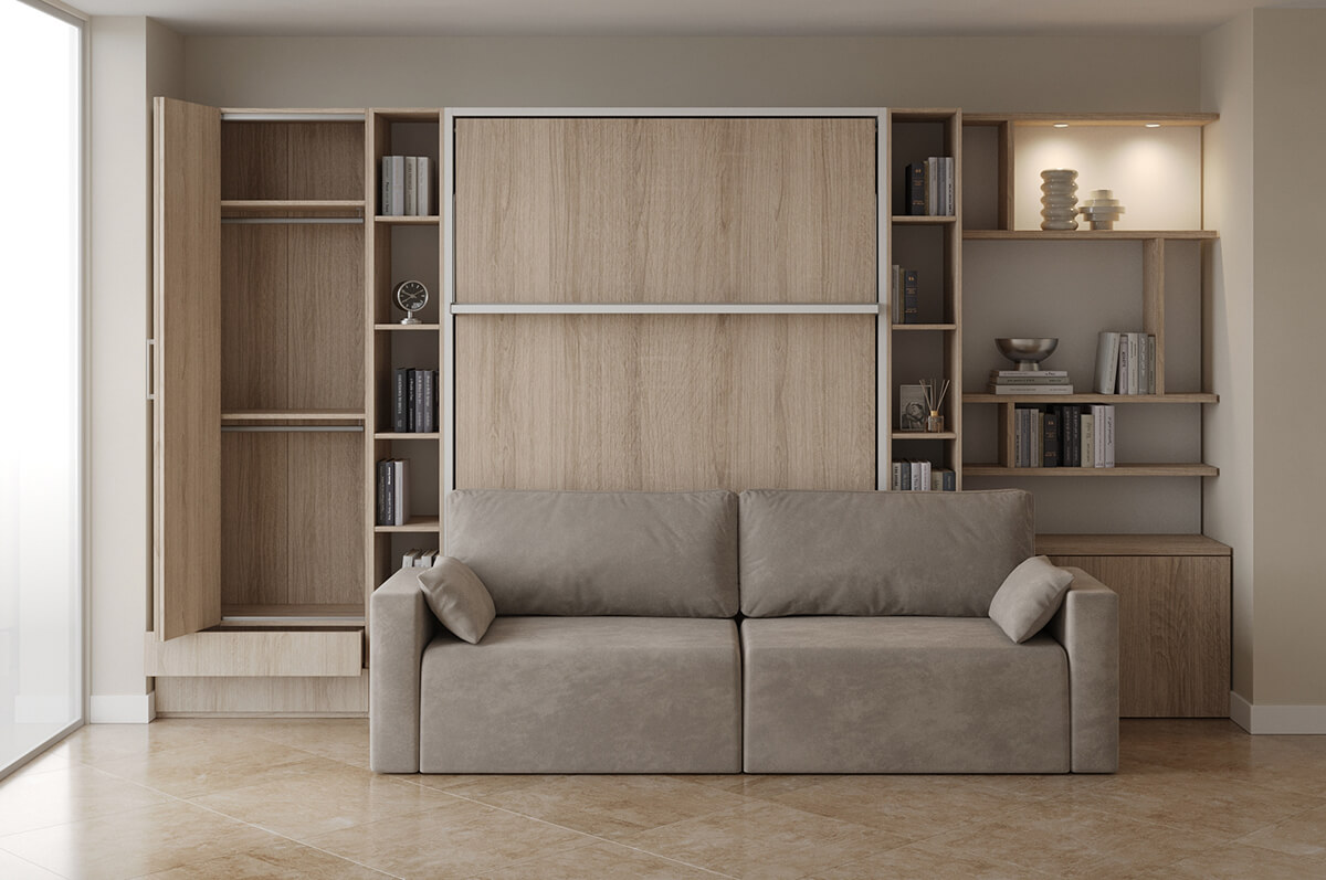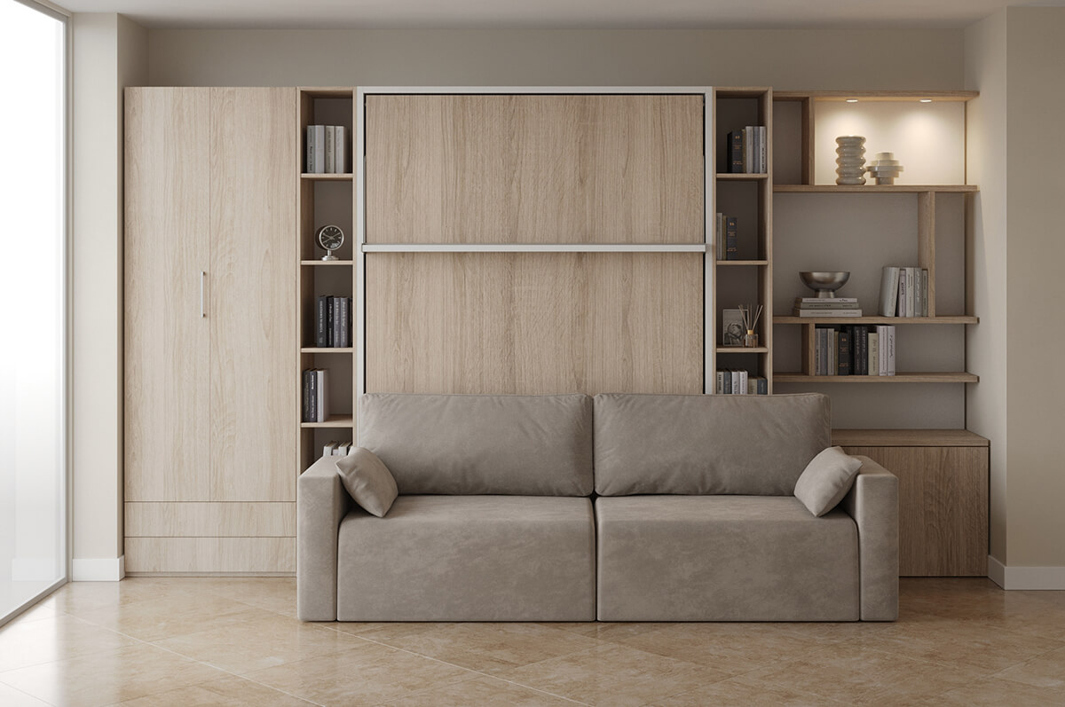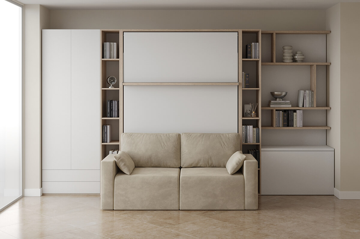 D - ROYAL Queen Wall Bed with Sectional Sofa and Bookcase Set