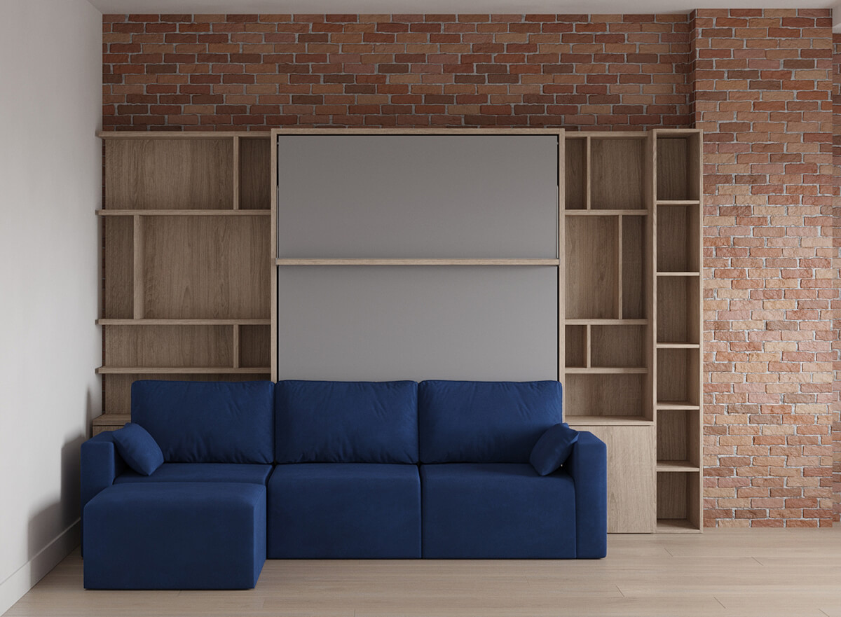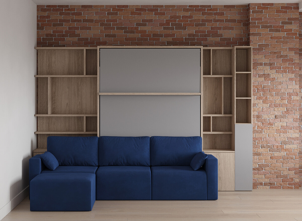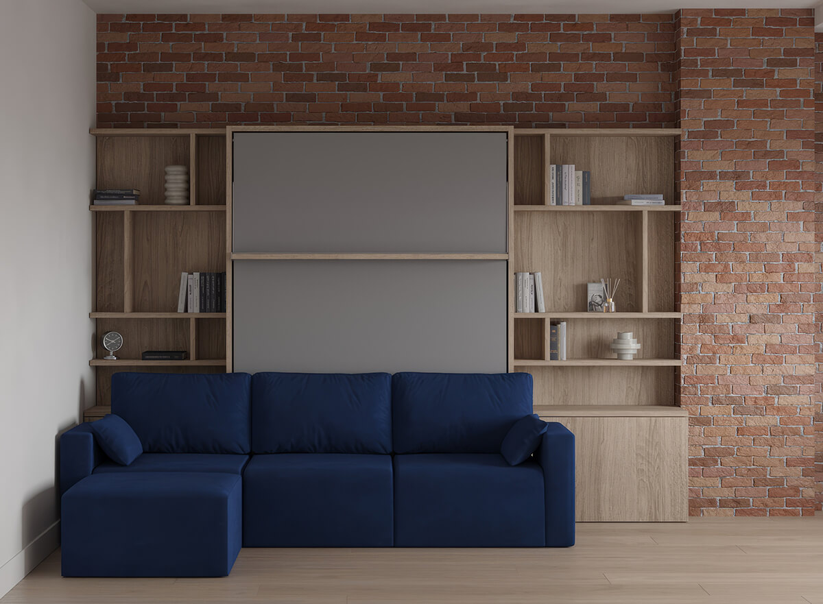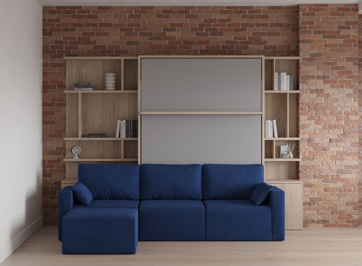 D - Royal Queen Wall Bed with Sectional Sofa and Bookcase Set