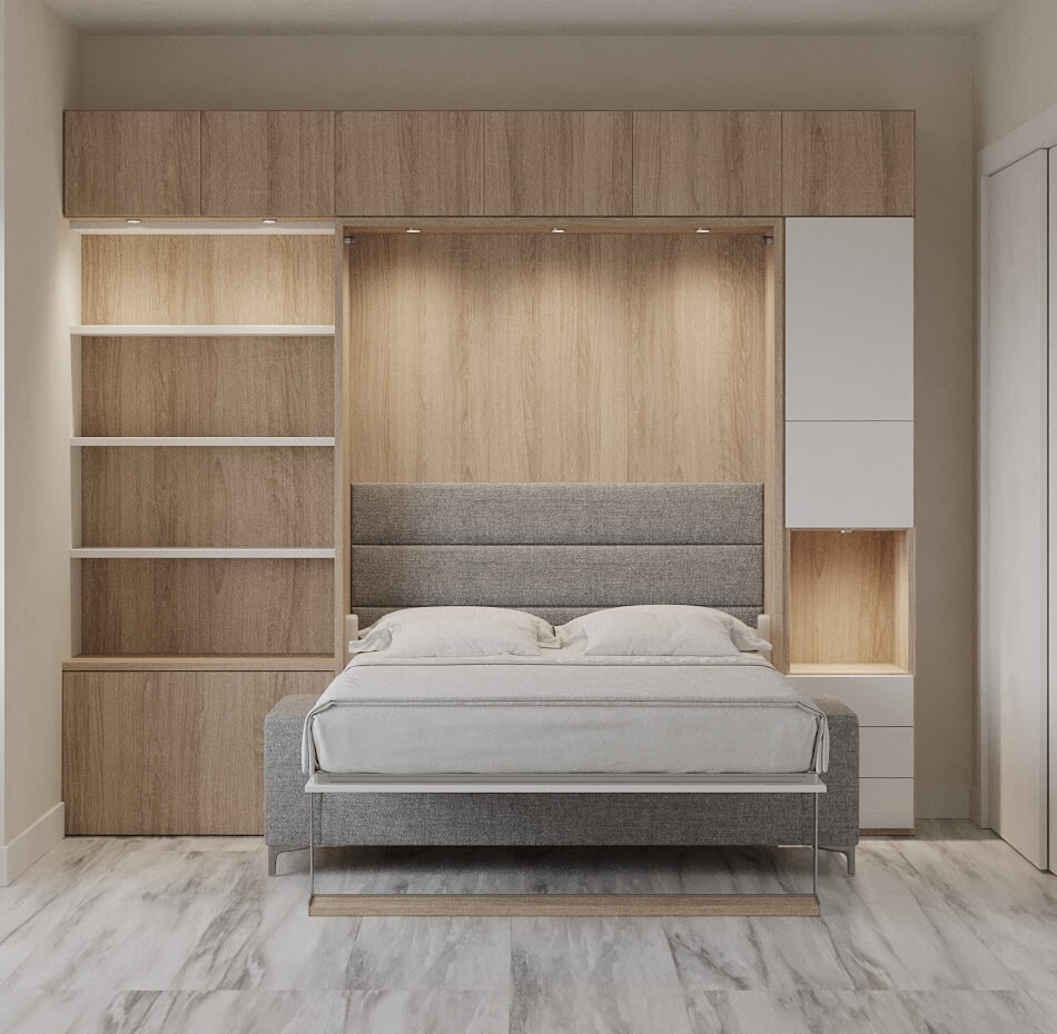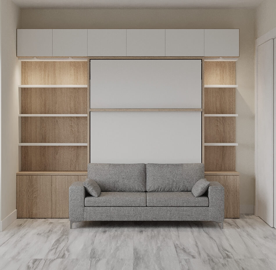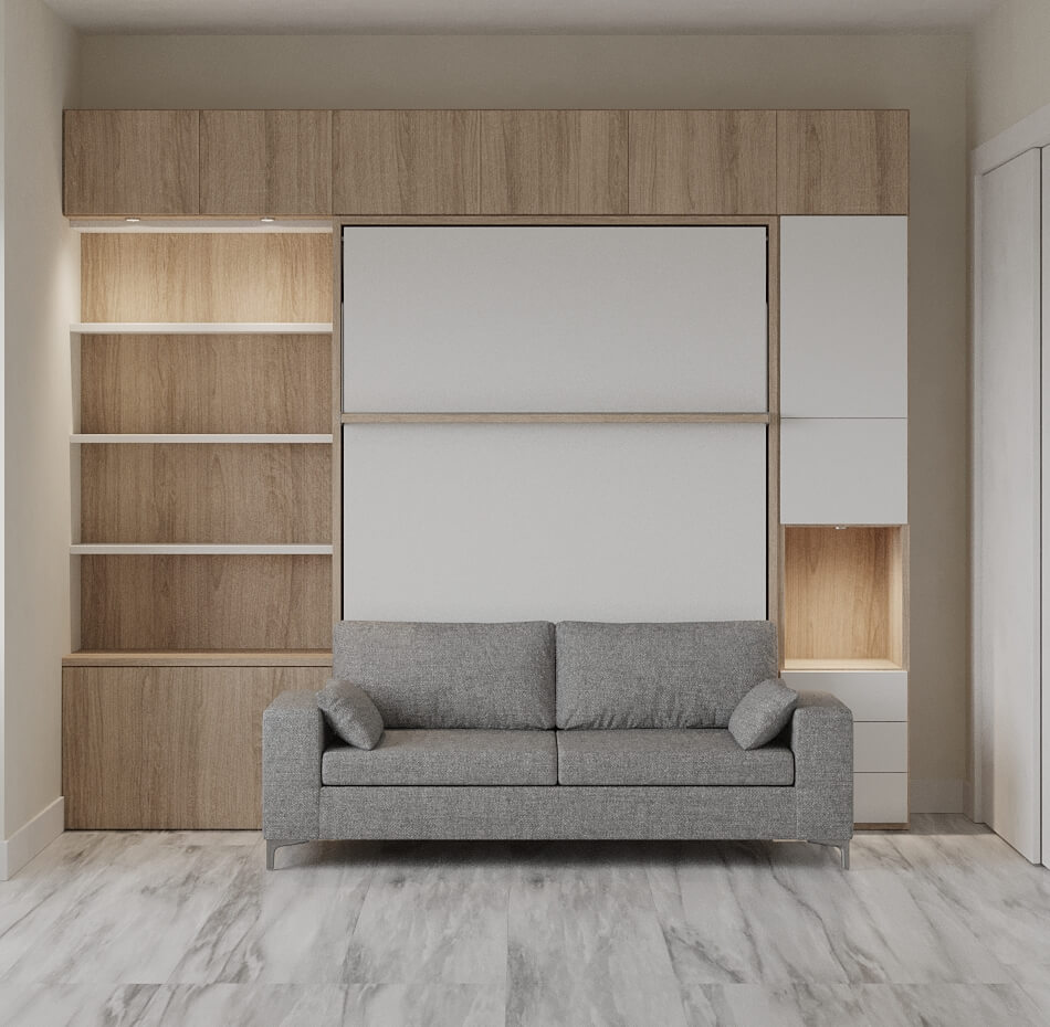 D - Royal Queen Wall Bed with Sectional Sofa, Bookcases and Wardrobe