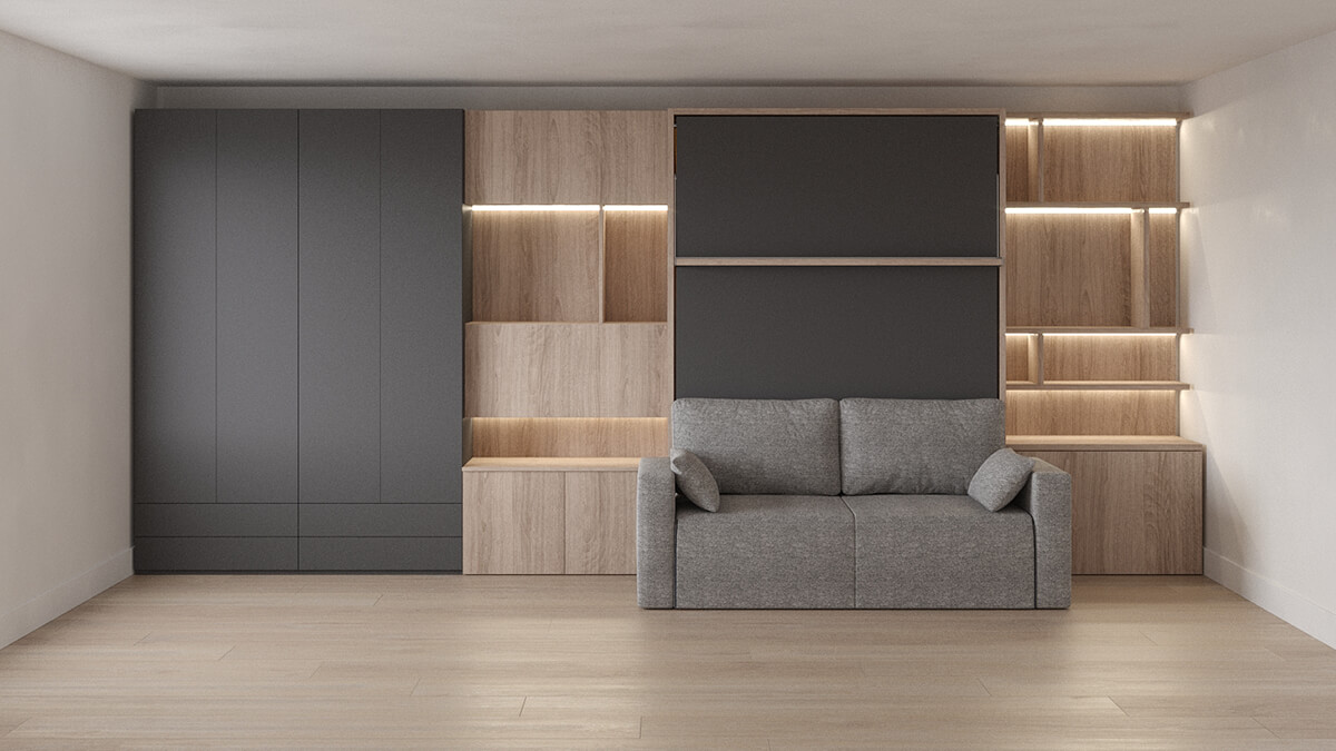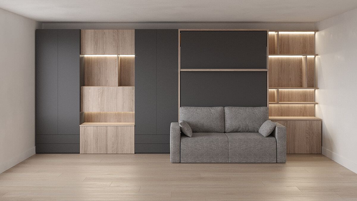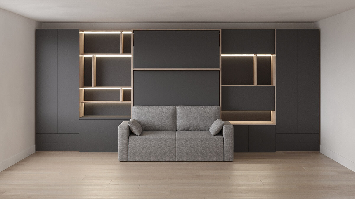 D - ROYAL Queen Wall Bed with Sectional Sofa, Wardrobes and Bookcase
