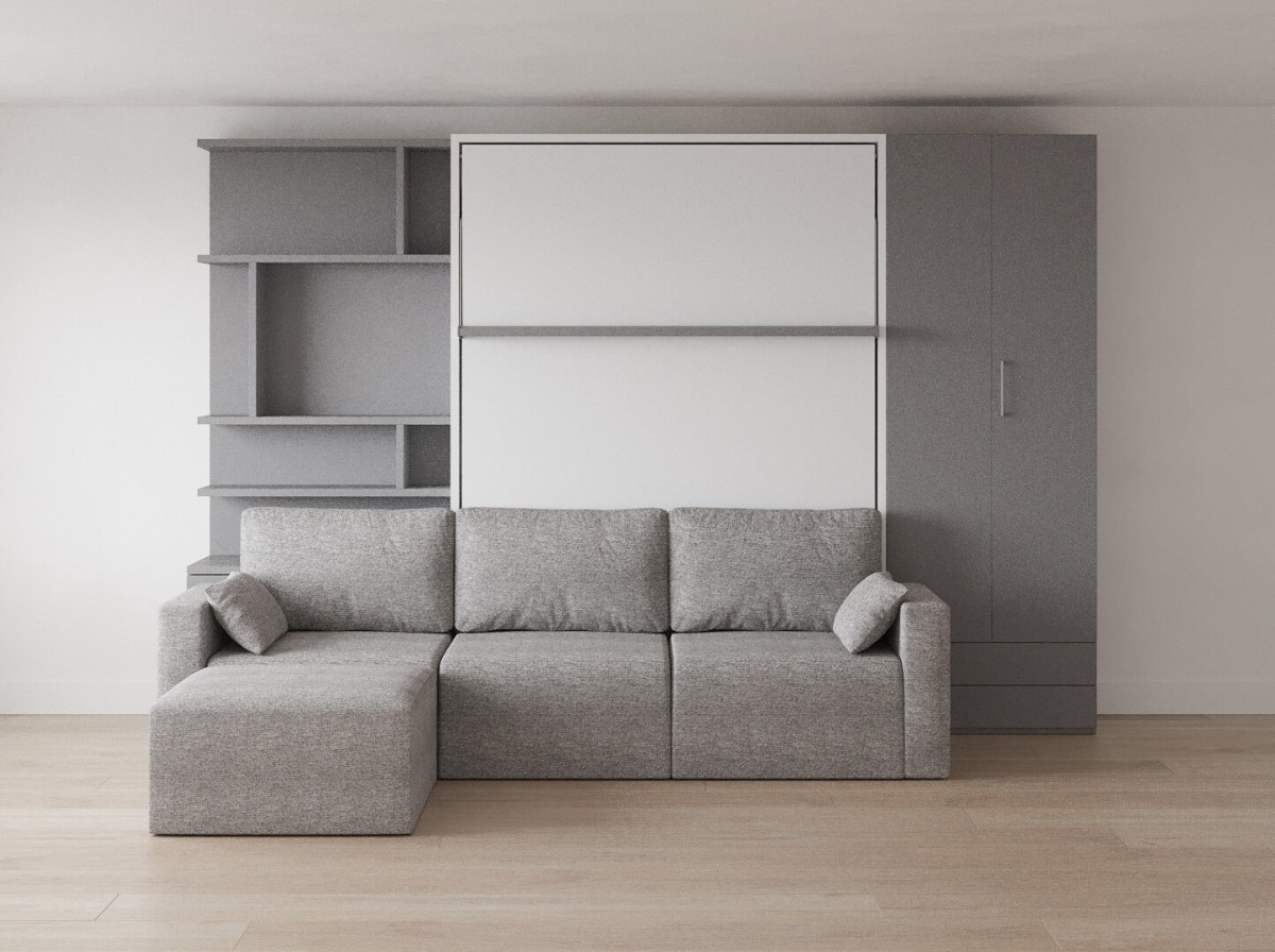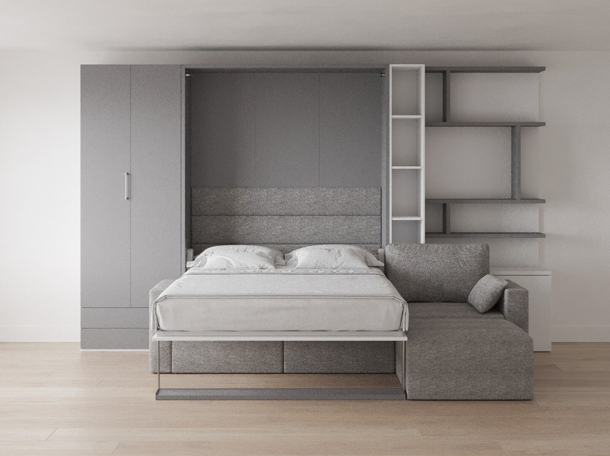 D - Royal Queen Wall Bed with Sectional Sofa, Wardrobes and Bookcase
